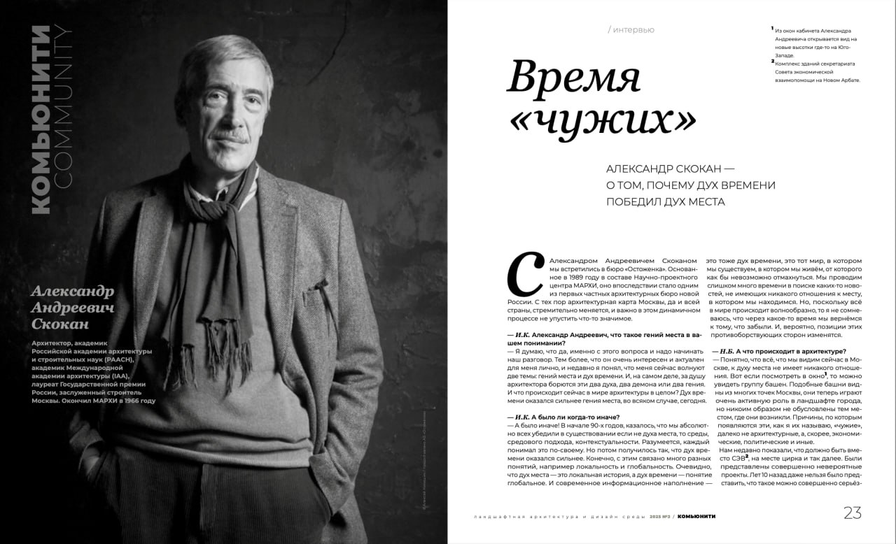 Наталья Браславская, основатель и издатель издания «…о неразрывной связи архитектуры с окружающим ландшафтом, природой, с экологией и живым миром» – выходящего с 2023 года журнала 🌱 «Гений места. Genius loci», 🌿 – рассказывает о своем издании и его последних по времени номерах. Там есть интервью с Александром Скоканом и Борисом Левянтом – и многое другое.
